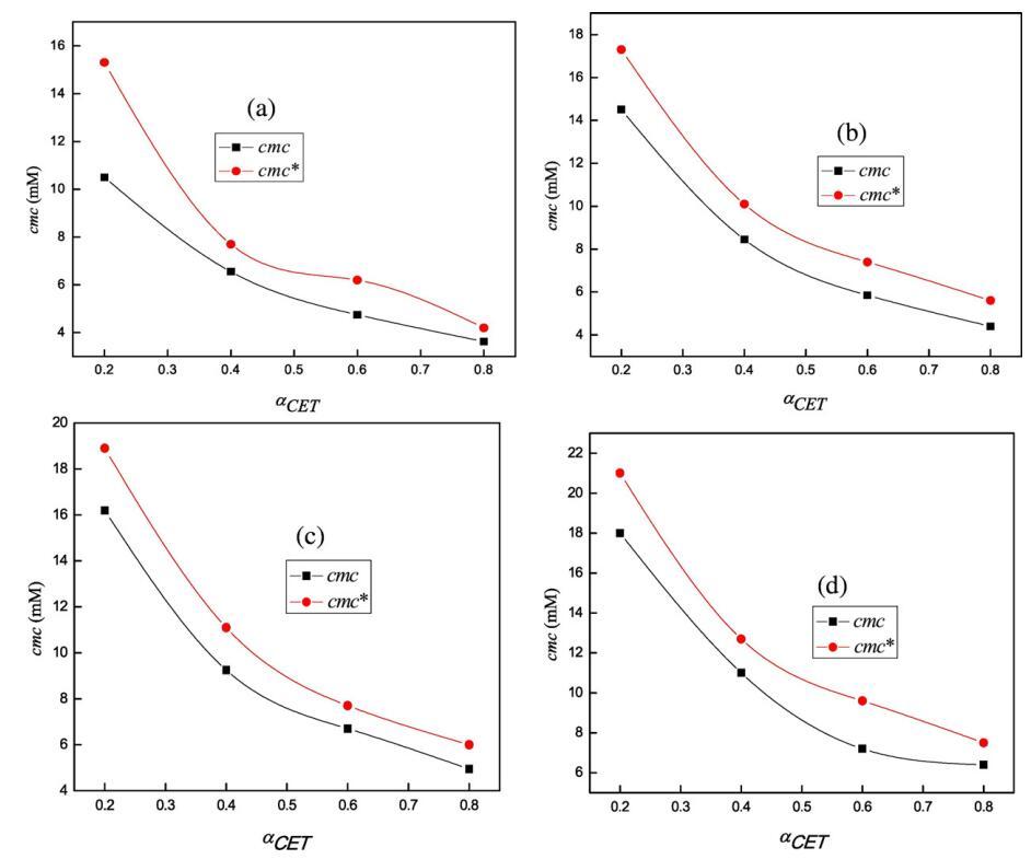 圖4。cmc的變化(■)在298.15 K條件下,在不同體積百分比的二甘醇-水混合物(a)存在于純水中(b)5 v/v%二甘醇-水(c)10 v/v%二甘醇-水和(d)15 v/v%二甘醇-水中時,使用αCET的cmc*()。