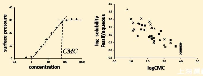 表面張力由一種成熟的體外測定法測定,該測定法通過測量化合物的臨界膠束濃度和兩親性來評估化合物的表面活性劑性質。 兩親性是用于量化化合物與生物膜親和力的一個關鍵屬性,在制藥工業中廣泛用于預測藥物誘導的磷脂病,11,12 ? 腦屏障滲透,13和藥物淋巴吸收。 14在這項工作中,我們同樣評估了化合物對生物相關介質中所含膠束的親和力是否可以用化合物固有的表面活性劑性質來解釋。 因此,我們對不同化合物的表面活性劑性質進行了表征,以將此類表面活性性質與FaSSIF中觀察到的與水介質溶解度相比的溶解度增強程度相關聯。 共分析了51個分子,包括上市藥物和羅氏專利化合物,具有廣泛的溶解性、親脂性和電離狀態。