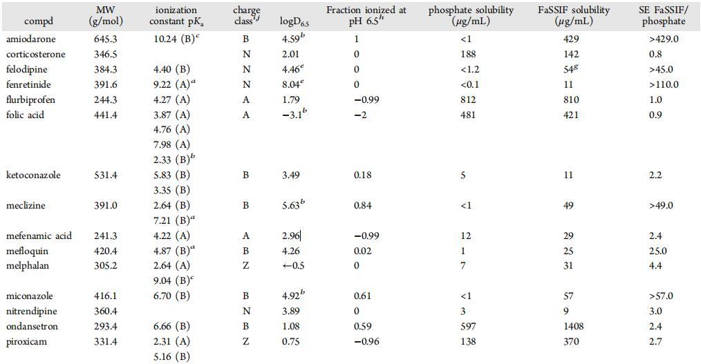 在FaSSIF和水性緩沖液中的溶解度評估和物理化學(xué)特性。選擇了一組21種上市藥物和30種來自不同研究項(xiàng)目的羅氏化合物,因?yàn)樗鼈冊趐H值為6.5的水性緩沖液和FaSSIF介質(zhì)中的溶解度不同。作為標(biāo)準(zhǔn)做法,所有溶解度和表面壓力剖面測量均在室溫下進(jìn)行,而不是在37°C下進(jìn)行。盡管溫度可能會影響藥物溶解度、脂質(zhì)聚集體分配和溶解,據(jù)報(bào)道,牛磺膽酸膠束的聚集數(shù)對溫度變化相對不敏感。19該化合物組包含不同的化學(xué)性質(zhì)、廣泛的親脂性,并涵蓋不同類型和程度的電荷狀態(tài),包括中性、酸性、堿性和兩性離子分子。表1列出了主要理化性質(zhì)和溶解度數(shù)據(jù)。