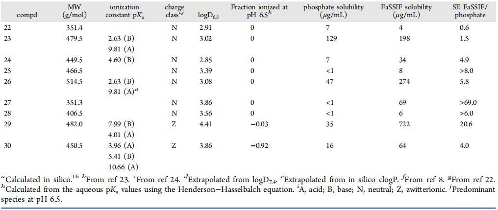 以前曾使用一組參考化合物觀察到,電離酸性化合物的硒通常低于電離堿。結(jié)果表明,由于與帶負(fù)電荷的FaSSIF介質(zhì)組分之間的靜電排斥作用,離子酸在FaSSIF中的溶解度沒有增加。8在目前的研究中,對于幾個(gè)涵蓋更廣泛化學(xué)空間的專利化合物,我們沒有發(fā)現(xiàn)離子化酸或堿之間硒的任何顯著溶解度差異,這表明靜電相互作用可能被其他因素掩蓋或覆蓋,如化合物的構(gòu)象和親油性。