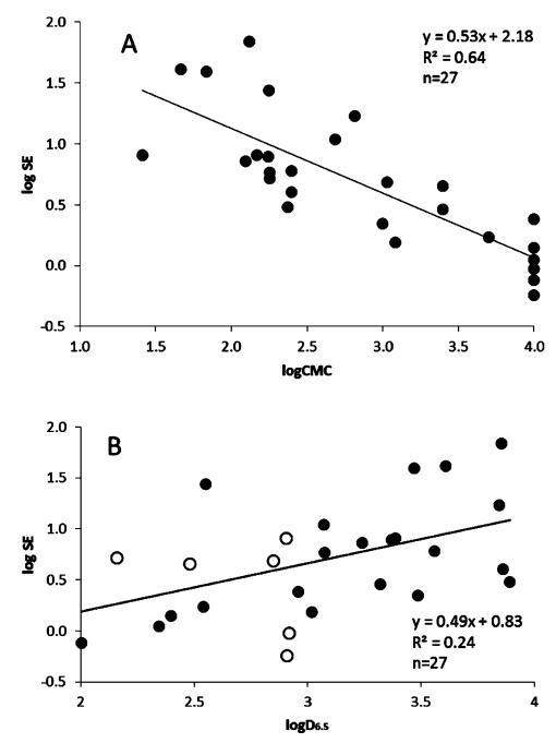 圖5。根據(jù)對數(shù)CMC(μM,A)和pH 6.5下的辛醇分配系數(shù)(logD6.5;B)繪制溶解度增強(qiáng)曲線。數(shù)據(jù)集僅限于顯示logD6的化合物。5個(gè)在2到4之間。圖B中的開放圓對應(yīng)于從文獻(xiàn)檢索、預(yù)測或從pH值為7.4的logD推斷的logD值。高于或低于檢測限的值在檢測限處繪制。