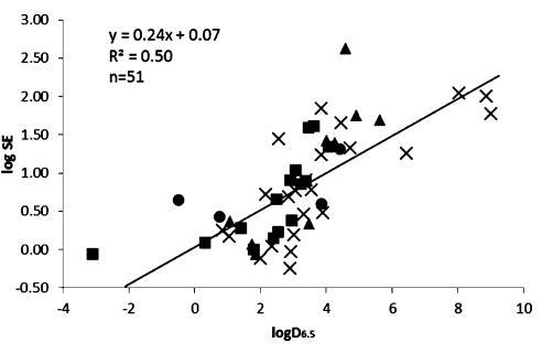 圖2。在pH值為6.5時(shí),51種化合物的溶解度增強(qiáng)(SE=S_-FaSSIF/S_-水溶液)是辛醇/水分配系數(shù)的函數(shù)。化合物被歸類為酸(■),基地(▲),中性(×)和兩性離子(●).高于或低于檢測限的值在檢測限處繪制。