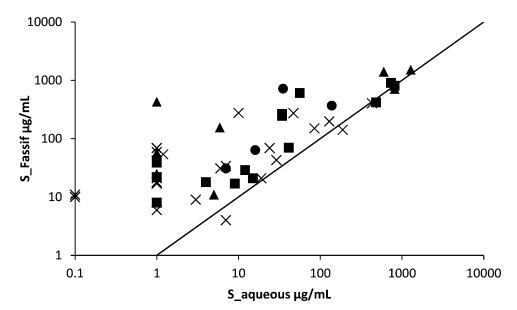 圖1。測定了51種化合物在磷酸鹽和FaSSIF緩沖液中pH值為6.5時(shí)的平衡溶解度。化合物被歸類為酸(■),基地(▲),中性(×)和兩性離子(●).線對應(yīng)于單位線。低于檢測限的值在檢測限處繪制。