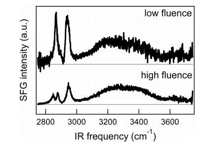 圖7。高密度水上DPPC的SFG光譜(SSP極化)(~每分子45?2)在低濃度下(~1.5 mJ/cm2)和高通量(~10 mJ/cm2),單脈沖加熱量分別在0.3至3°C(取決于紅外頻率)和2至19°C之間。為了清晰起見,對(duì)光譜進(jìn)行了偏移,并根據(jù)相對(duì)紅外強(qiáng)度進(jìn)行了縮放。注意,由于在高通量下發(fā)生的熱效應(yīng),形狀非常不同。這兩種光譜都是用非旋轉(zhuǎn)槽測(cè)量的。