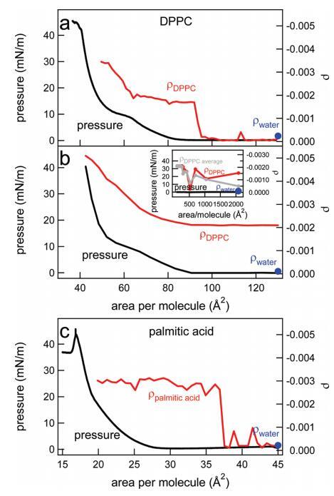 圖8。(a)在制備單分子層后,通過快速添加DPPC溶液持續(xù)壓縮單分子層,直到達(dá)到130?2的每分子面積,水上DPPC的表面壓力(黑色,左軸)和橢圓系數(shù)(紅色,右軸)。(b)水上DPPC的表面壓力(黑色,左軸)和橢圓系數(shù)(紅色,右軸)是每個(gè)分子面積的函數(shù)。通過逐滴添加更多DPPC,每次滴加間隔幾分鐘,改變了該區(qū)域。以這種方式達(dá)到的每個(gè)分子的最小面積為2000?2。插圖顯示了橢圓度系數(shù)(對(duì)于一個(gè)特定實(shí)驗(yàn)(紅色)和三個(gè)實(shí)驗(yàn)的平均值(灰色))以及非常低密度下的壓力。(c)在制備單分子層后,通過快速添加棕櫚酸溶液,直到達(dá)到每分子45?2的面積,連續(xù)壓縮單分子層期間,水上棕櫚酸的表面壓力(黑色,左軸)和橢圓系數(shù)(紅色,右軸)。在噴灑表面活性劑之前測(cè)量的純水橢圓度在每個(gè)面板中以藍(lán)色圓點(diǎn)表示。