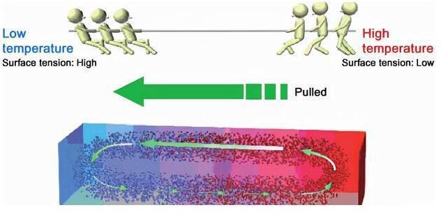 在兩種液體相互接觸的時(shí)候,表面張力強(qiáng)的液體會(huì)將表面張力弱的液體拉過來,這股力會(huì)將表面張力弱的液體反向倒吸進(jìn)表面張力強(qiáng)的液體之中,科學(xué)家將這一現(xiàn)象命名為馬拉高尼效應(yīng)。導(dǎo)致這一現(xiàn)象發(fā)生的條件有很多,比如液體的濃度含量,溫度的高低都會(huì)讓兩種液體產(chǎn)生馬拉高尼效應(yīng)。
