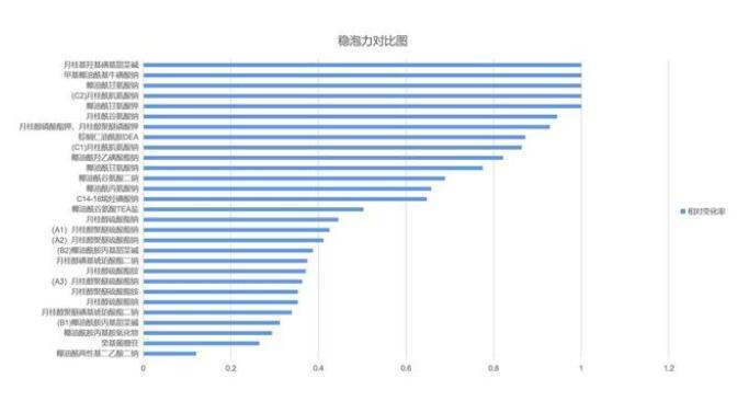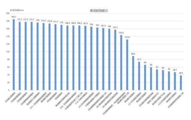 通過對比和排序,我們很快就能篩選出起泡能力好的表活劑,同時也能得到表活劑的起泡規(guī)律:(ps:由于相同原料出于不同廠商,其泡沫性能也存在差異,此處用不同大寫字母代表不同的原料廠商)