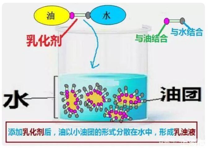 兩種互不相容的液體混合到一起,不管怎么攪拌,只要靜置一段時間,它們就又會出現分層的現象。這是表面張力的作用,液滴中的不溶液滴聚集,最終只能向分層的狀態變化。而如果加入了乳化劑,情況就不一樣了,由于乳化劑既有親水基團,又有疏水基團,所以構成了兩種液體之間的橋梁。