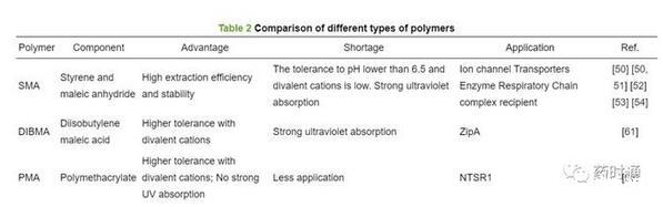 盡管SMA和DIBMA在一些MPs的分離純化中取得了成功[63],但存在SMA對二價陽離子耐受性低、DIBMA提取純度和穩定性低的缺陷并且這兩種聚合物都有強烈的紫外吸收,可能干擾紫外檢測[57]。因此人們開始尋找非“烯烴-馬來酸支架”替代聚合物。最近,兩親性聚甲基丙烯酸酯聚合物(polymethacrylate,PMA)被證明可將脂質雙分子層溶解成納米圓盤。PMA比常見的苯乙烯-馬來酸聚合物具有潛在的優勢,但目前PMA對于MPs的純化應用較少[64]。Lavington等[63]以神經緊張素受體1(NTSR1)為對象,探索使用PMA的無洗滌劑純化。通過使用Sf9細胞中表達的NTSR1-eGFP融合蛋白,篩選了一系列的增溶條件,證明了溫度、pH、NaCl濃度以及聚合物和膜樣品的相對數量的重要性。此外還發現PMA對二價陽離子有一定耐受性。PMA溶解的NTSR1比洗滌劑溶解的NTSR1表現出更大活性,這表明PMALPs為NTSR1提供了更天然的膜環境[63]。因此,PMA是一種可替代SMA的MPs純化方法,在研究NTSR1和其他MPs方面具有良好的前景。表2比較了SMA、DIBMA、PMA的組成、優缺點及其應用。