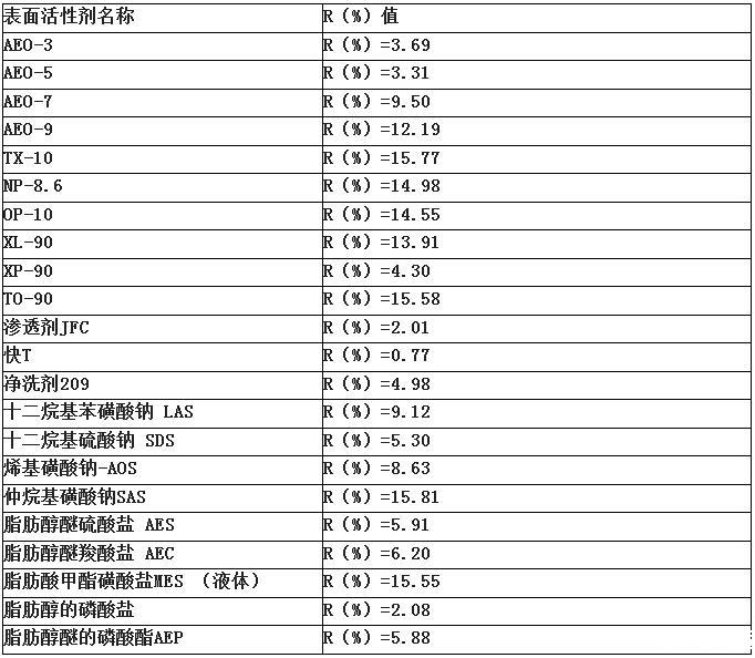 R值越大,表明凈洗能力越強,該測試標(biāo)準(zhǔn)可用來表征表面活性劑對一般污垢的去除,不適用于反映油脂和蠟質(zhì)的去除能力。
