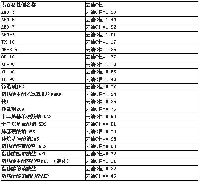C=試樣去油質(zhì)量/標(biāo)準(zhǔn)配方去油質(zhì)量,C值越大,表明表面活性劑的去油能力越強。