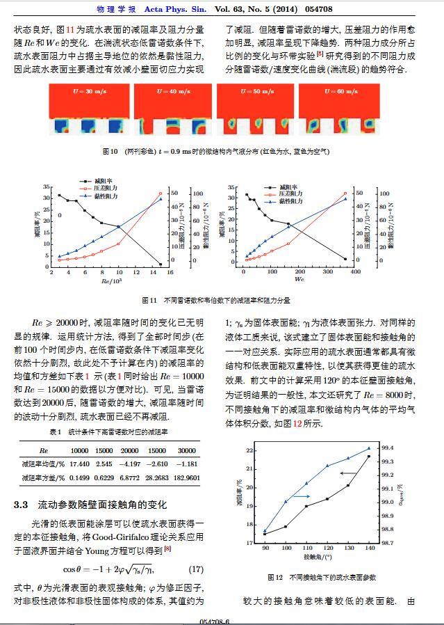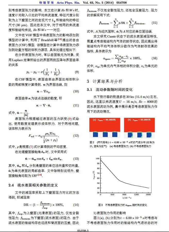 通過構造具有棋盤狀微結構的疏水表面,考慮表面張力的影響,利用定常與非定常結合的數值模擬方法,研究了疏水表面在湍流狀態下的減阻特性以及微結構內氣體封存的效果,其中Re=3000—30000.在低雷諾數下,疏水表面微結構內氣體封存狀態良好,減阻率最高約為30%;隨著雷諾數的增大,壓差阻力增大,減阻率有下降趨勢.當來流速度過大時,水會大量進入微結構,疏水表面的減阻率變化劇烈,且已經不再減阻.結果表明,表面張力削弱了壁面切應力的影響,使得低雷諾數下微結構內氣體能夠有效封存,進而減小壁面阻力.