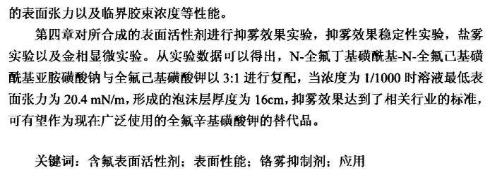 第四章對所合成的表面活性劑進行抑霧效果實驗,抑霧效果穩定性實驗,鹽霧實驗以及金相顯微實驗。從實驗數據可以得出,N-全氟丁基磺?;?N-全氟己基磺酰基亞胺磺酸鈉與全氟己基磺酸鉀以3:1進行復配,當濃度為1/1000時溶液最低表面張力為20.4mN/m,形成的泡沫層厚度為16cm,抑霧效果達到了相關行業的標準,可有望作為現在廣泛使用的全氟辛基磺酸鉀的替代品。