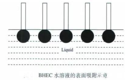 乙醇和正丁醇屬于一元醇,這兩種醇的加入能使BHEC水溶液的表面張力減小。當(dāng)未加入一元醇時,BHEC溶于水后,BHEC分子能自發(fā)地吸附在溶液的表面,使溶液的表面張力降低,表面吸附的BHEC分子越多,溶液表面張力的降幅越大,當(dāng)然這其中有一個吸附飽和的問題。但由于BHEC分子在水中處于空間交聯(lián)網(wǎng)絡(luò)結(jié)構(gòu),其定向排列時分子間存在一定的空間(見上圖)。加入乙醇或正丁醇后,醇分子可以插入BHEC分子間的空隙,使溶液表面吸附的分子達(dá)到緊密排列的狀態(tài)(見下圖),導(dǎo)致BHEC水溶液的表面張力繼續(xù)降低。