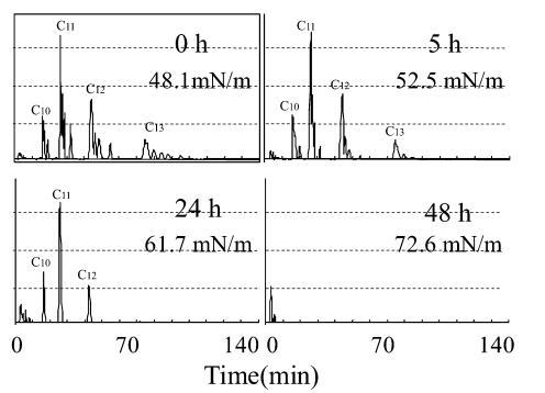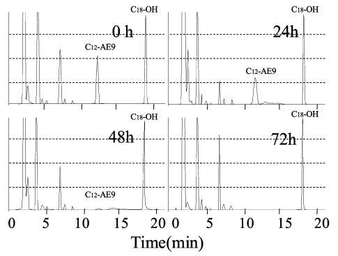 用高效液相色譜法分析生物降解過程中AE 的色譜圖如圖8 所示,其中10 毫克/升C12-AE9 的峰出現(xiàn)在11 分鐘的保留時(shí)間,作為內(nèi)標(biāo)的C18 醇出現(xiàn)在18 分鐘的保留時(shí)間。 在 8 分鐘的保留時(shí)間之前觀察到主要由衍生產(chǎn)物引起的干擾峰。 10mg/L AE9 的大部分峰在 48 小時(shí)后消失(圖 8),而圖 3 中此時(shí)基于需氧量的生物降解保持 35%。此時(shí)表面張力值達(dá)到約 72.8 mN/m . 因此,表明AE9在其生物降解率低于50%的時(shí)間內(nèi)失去了其界面活性和水生毒性。