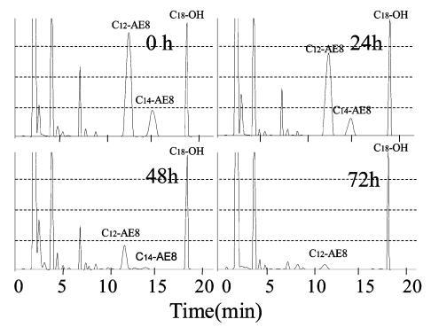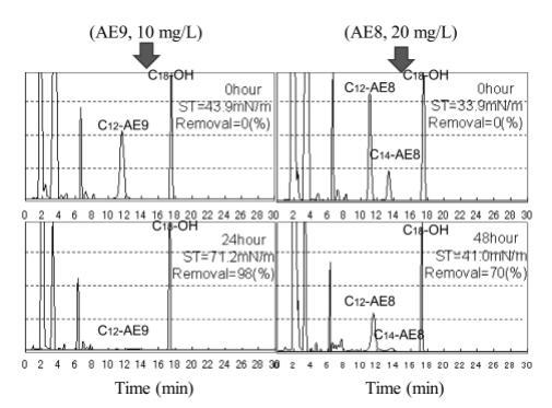 使用商用 AE8 進(jìn)行生物降解測試獲得的結(jié)果如圖 9 所示,其中 C12-AE8 和 C14-AE8 的峰分別在保留時(shí)間 11 分鐘和 14 分鐘附近觀察到。 觀察到18分鐘內(nèi)標(biāo)峰和8分鐘前的干擾峰以及圖8中AE9的結(jié)果。24小時(shí)后觀察到AE8峰面積減少,72小時(shí)峰消失。 144 小時(shí)(6 天)后表面張力值達(dá)到約 72.8 mN/m,而生物降解率僅為 45%,死亡率在 48 小時(shí)時(shí)降至 0%(圖 5)。 與 10 mg/L AE9 的結(jié)果相似,20 mg/L AE8 的水生毒性在基于需氧量的生物降解增加到 50% 之前消失。