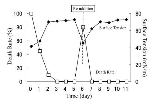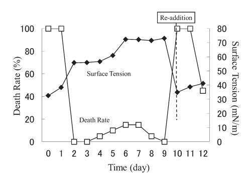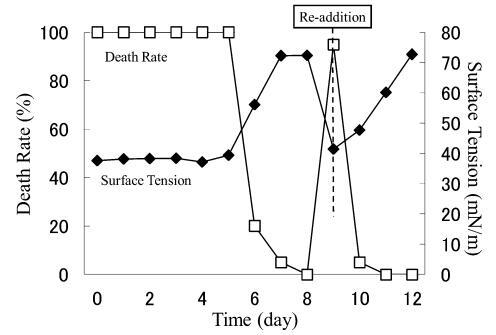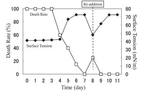 結(jié)果,在第8天重新加入LAS使試液的表面張力降低到與初始階段相同的水平,但死亡率沒有達(dá)到100%。 重新添加后不久,觀察到表面張力值迅速增加,水生毒性和死亡率迅速下降。 重新添加 LAS 后,死亡率暫時(shí)增加,但隨后立即降至 0%。 重新添加后第 2 天,表面張力值達(dá)到約 72.8 mN/m。