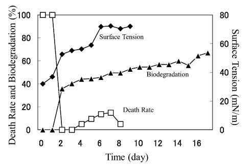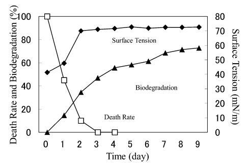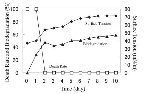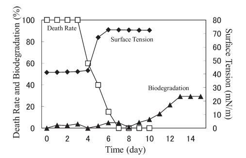 AE 的生物降解速度比 LAS 快。 對于 10 mg/L AE9,BOD 和表面張力值在測試開始后立即開始增加,死亡率立即下降(圖 3)。 表面張力值在第 2 天達(dá)到約 72.8 mN/m。 該結(jié)果與之前的報(bào)告一致9),其中比較了基于 CO2 量的生物降解率(測量的 CO2 產(chǎn)量/理論 CO2 產(chǎn)量)和 CTAS 的降低率。 也就是說,Strum 研究中 CTAS 的降低對應(yīng)于我們研究中表面張力值的增加。