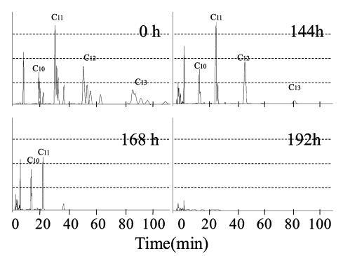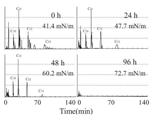 生物降解過程中10mg/L LAS的色譜圖,通過HPLC使用UV檢測器進(jìn)行分析,如圖6所示。在相應(yīng)的保留時(shí)間(RT)處出現(xiàn)不同碳鏈數(shù)的峰組:16至19.5分鐘為C10,26.5至32.5分鐘是C11,44到55分鐘是C12,74到95分鐘是C13。 由于苯基的結(jié)合位置不同,每個(gè)峰組都包含異構(gòu)體峰。 參考標(biāo)準(zhǔn)(和光純藥工業(yè)株式會社)用于識別每個(gè)峰。