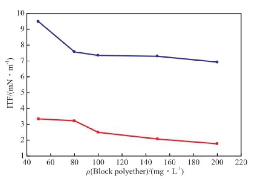 圖1兩種嵌段聚醚對油水界面張力的影響