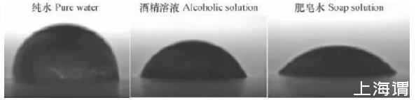 由上式可以看出,基質(zhì)吸力的大小與表面張力、接觸角和曲率半徑有關(guān)。其中,基質(zhì)吸力的大小與表面張力成正比,與彎液面曲率半徑成反比。因此,表面張力和曲率半徑的變化均會導(dǎo)致基質(zhì)吸力的改變。在環(huán)境溫度為25℃時,通過JC2000型接觸角測量儀對三種試樣的孔隙液體進(jìn)行接觸角測量。得到三種不同表面張力液滴的幾何形態(tài)圖如圖1所示,測量可得純水、酒精溶液和肥皂水對應(yīng)的接觸角分別為85°、65°和42°,而在25℃環(huán)境下,純水、20%酒精溶液、2 g L-1肥皂水的表面張力系數(shù)分別為:7.1×10-2N m-1、4.1×10-2N m-1、2.9×10-2N m-1。表面張力是決定彎液面形狀的主要因素之一,會影響曲率半徑和接觸角的大小。很顯然,表面張力大的液體接觸角變大,曲率半徑變小。圖1中水滴表面張力大于酒精溶液,但形成的彎液面半徑卻要小于酒精溶液,同樣的,酒精溶液形成的彎液面半徑又小于肥皂水。曲率半徑越小,土體中的基質(zhì)吸力越大。孔隙水表面張力會對彎液面的曲率半徑產(chǎn)生改變從而對基質(zhì)吸力產(chǎn)生影響,最終影響土壤的收縮開裂。