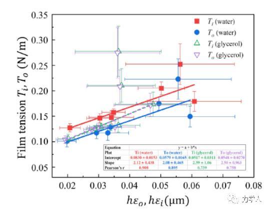基于該平衡構(gòu)型的解析解,本研究發(fā)現(xiàn)薄膜在接觸線附近的彈性應(yīng)變可以由薄膜的鼓包角解析給出。由此,本文給出了在一般條件下,薄膜在接觸線附近的彈性應(yīng)變隨鼓包角的解析關(guān)系。圖3表明,基于該解析關(guān)系給出的薄膜彈性應(yīng)變可以很好的描述薄膜總張力隨薄膜厚度及接觸線附近應(yīng)變的演化規(guī)律。基于此,本文提出了采用線性外推薄膜總張力隨薄膜厚度和接觸線附近薄膜應(yīng)變乘積的方法來確定固體表面張力的方案。