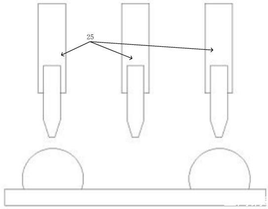 步驟S3:通過(guò)印刷機(jī)構(gòu)將摻入碳粉并通入正電荷的UV油墨鋪滿在紙張上,由于紙張上已覆蓋有固化的UV涂層,因此UV油墨在紙張上仍可自由移動(dòng),此時(shí)通過(guò)計(jì)算機(jī)處理印刷圖案,進(jìn)而控制印刷機(jī)構(gòu)向指定金屬探針輸送負(fù)電荷,其余金屬探針輸送正電荷,當(dāng)金屬探針接觸帶正電荷UV油墨時(shí),通過(guò)異電荷相互吸附的原理,UV油墨將向金屬探針聚攏;其余探針通過(guò)同電荷相互排斥的原理,UV油墨將向金屬探針?lè)捶较蛱右荩饘偬结樖栈兀琔V油墨將因表面張力短時(shí)間內(nèi)無(wú)法流平,再對(duì)紙張表層所有UV油墨進(jìn)行最終固化;